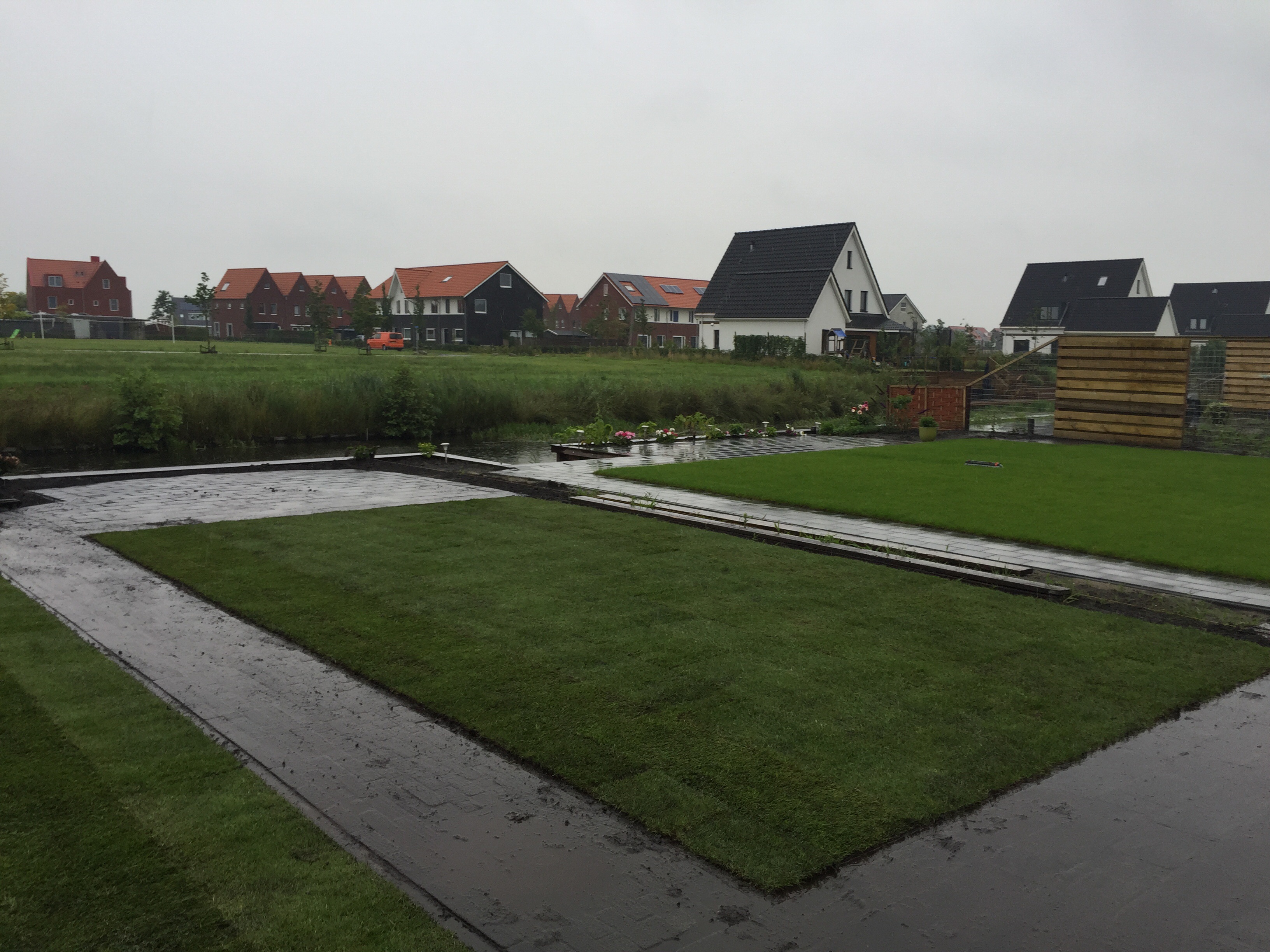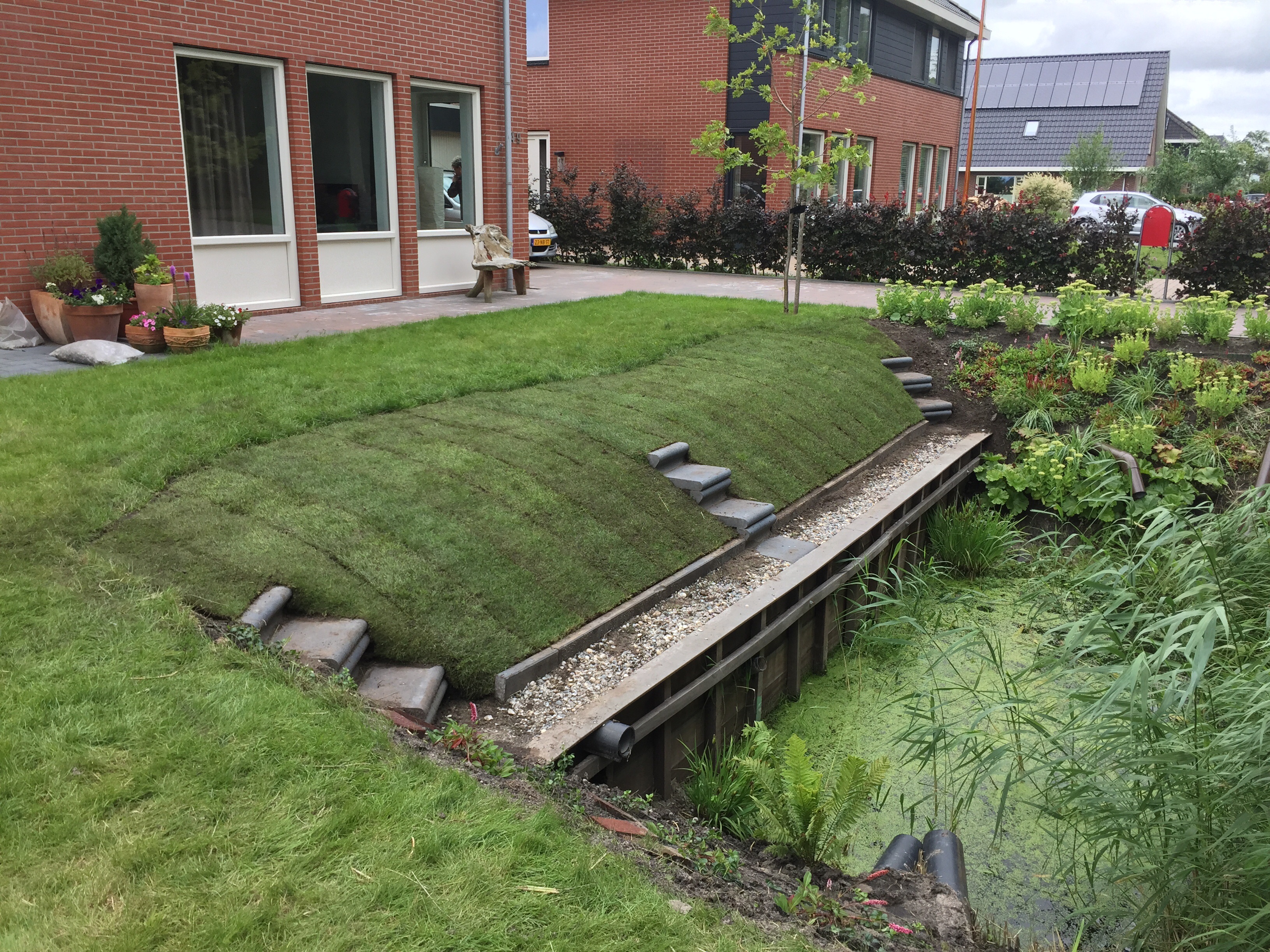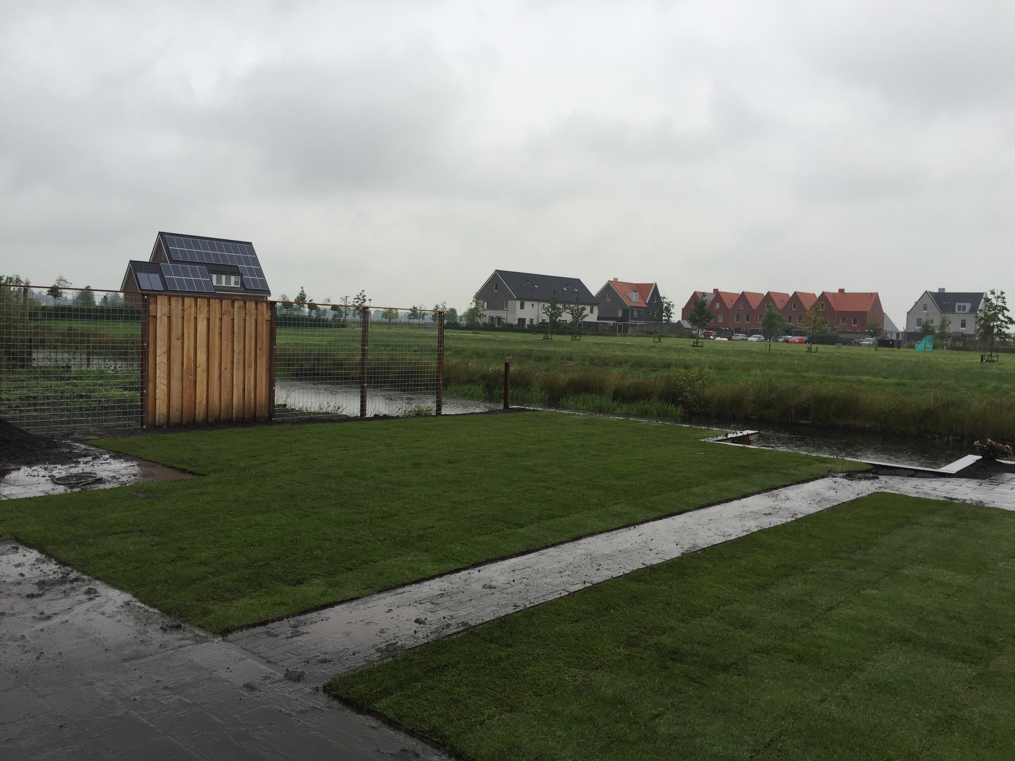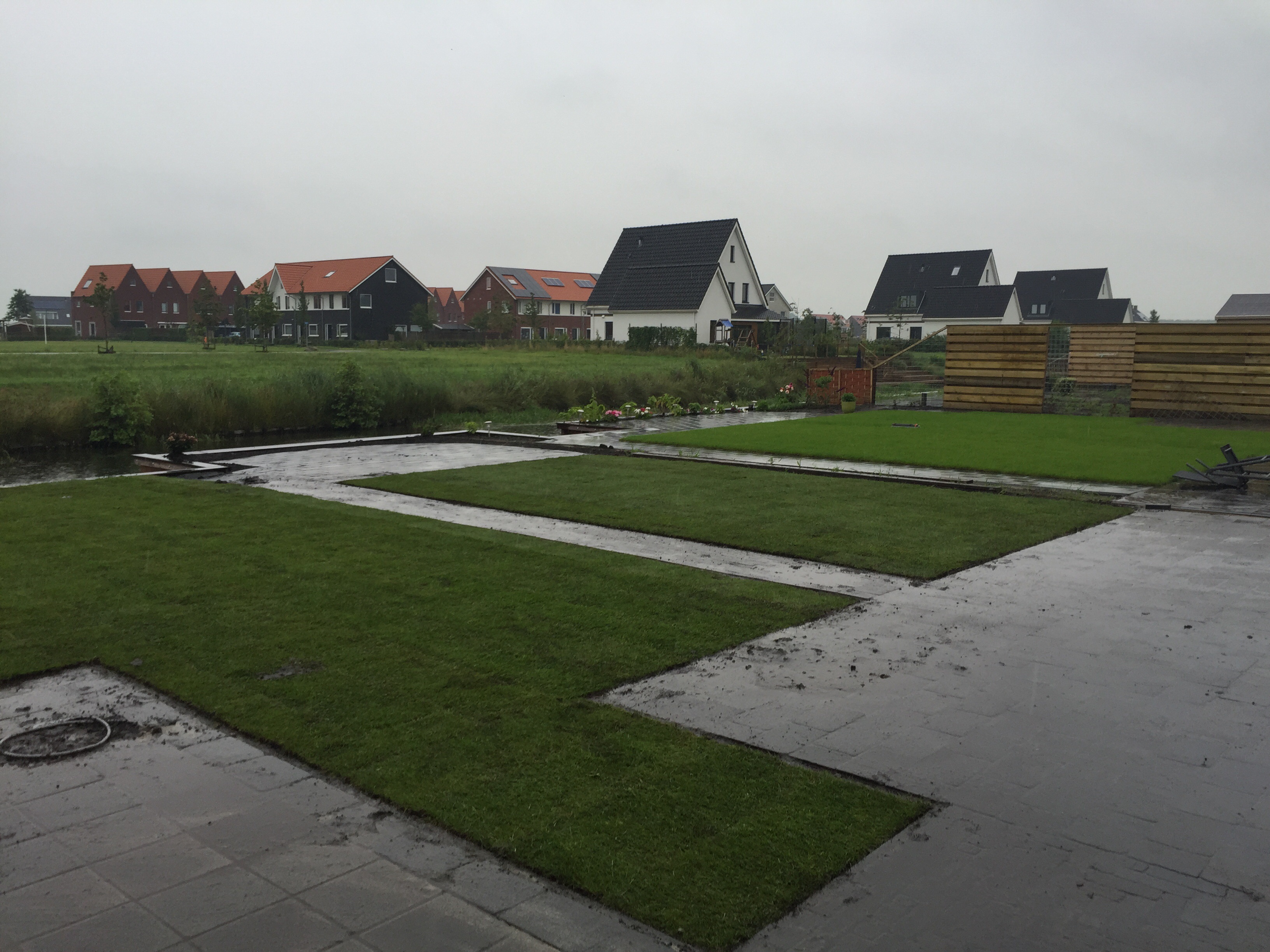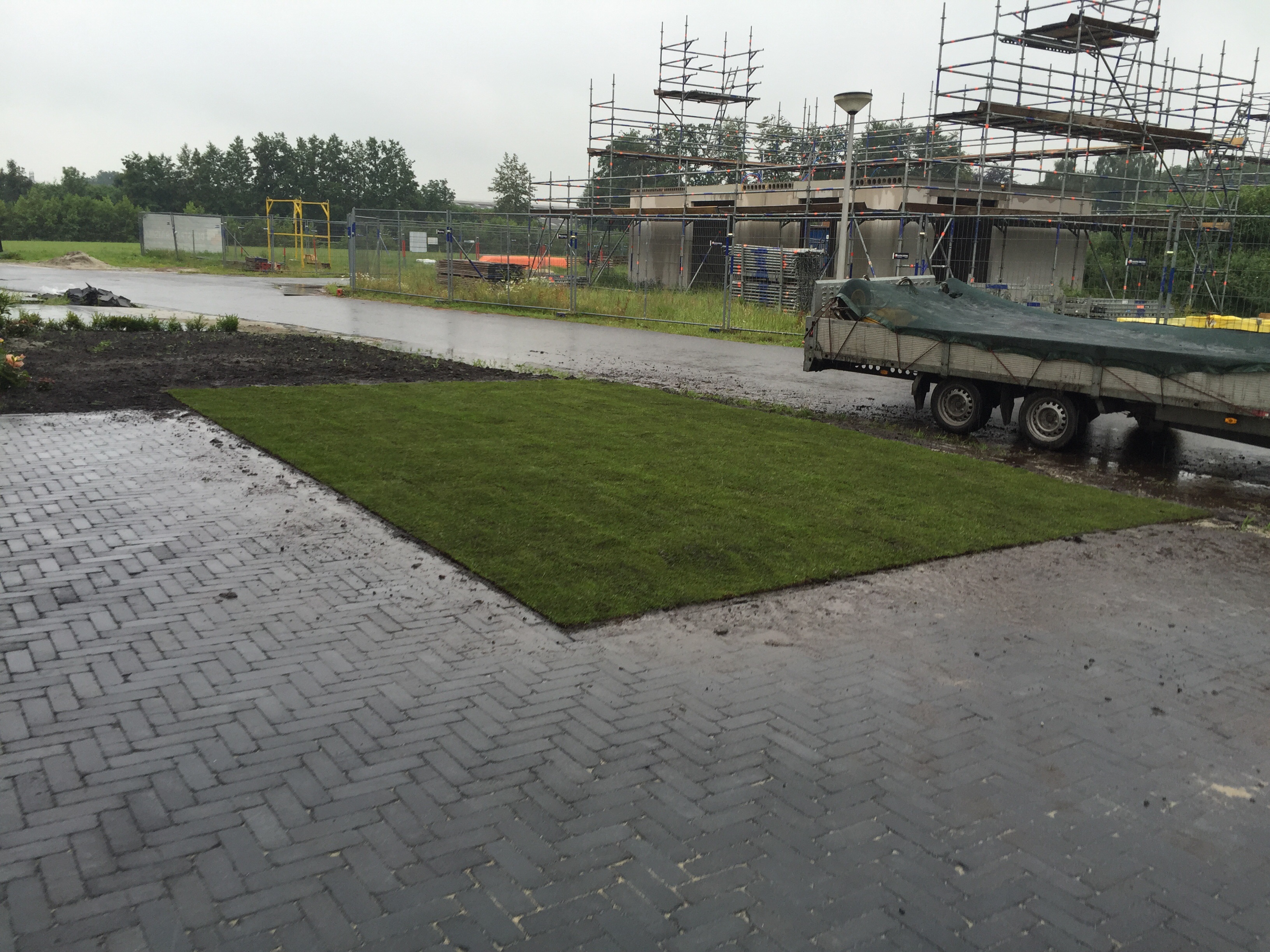 “ De geleverde grond was erg nat. Door het vocht veel bonken en klonten. Een aantal graszodenwaren gescheurd en er zaten nogal wat stenen tussen de matten. ”Lageman Graszoden